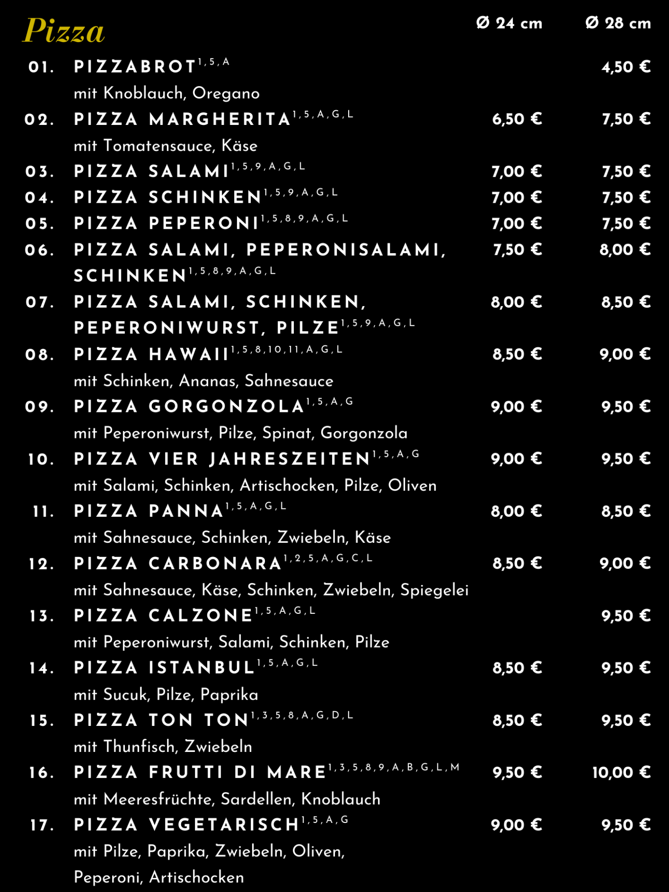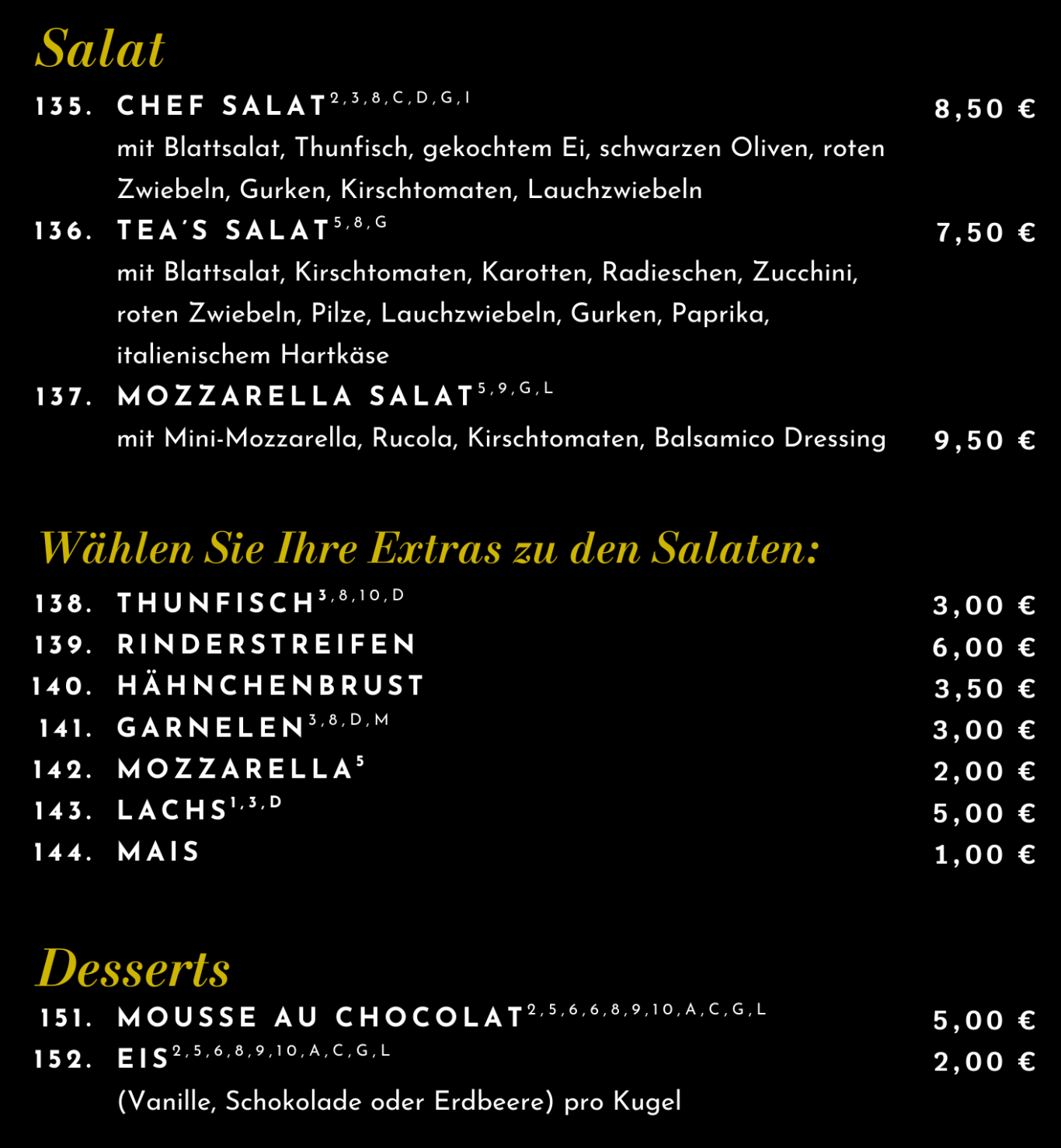 Zusatzstoffe: 1. Zöliakie / Weizen / Gluten 2. Hühnerei 3. Fisch 3. Meeresfrüchte 4. Nüsse 5. Laktose 6. Fructose 8. Konservierungsstoffe 9. Geschmacksverstärker 10. Farbstoffe 11. Phosphat 12. Sulfit 13. Koffein