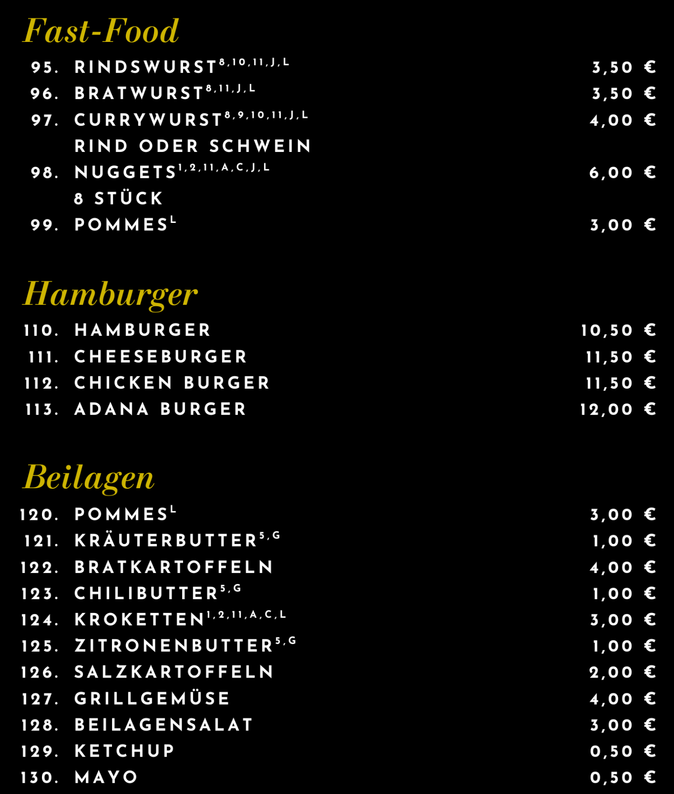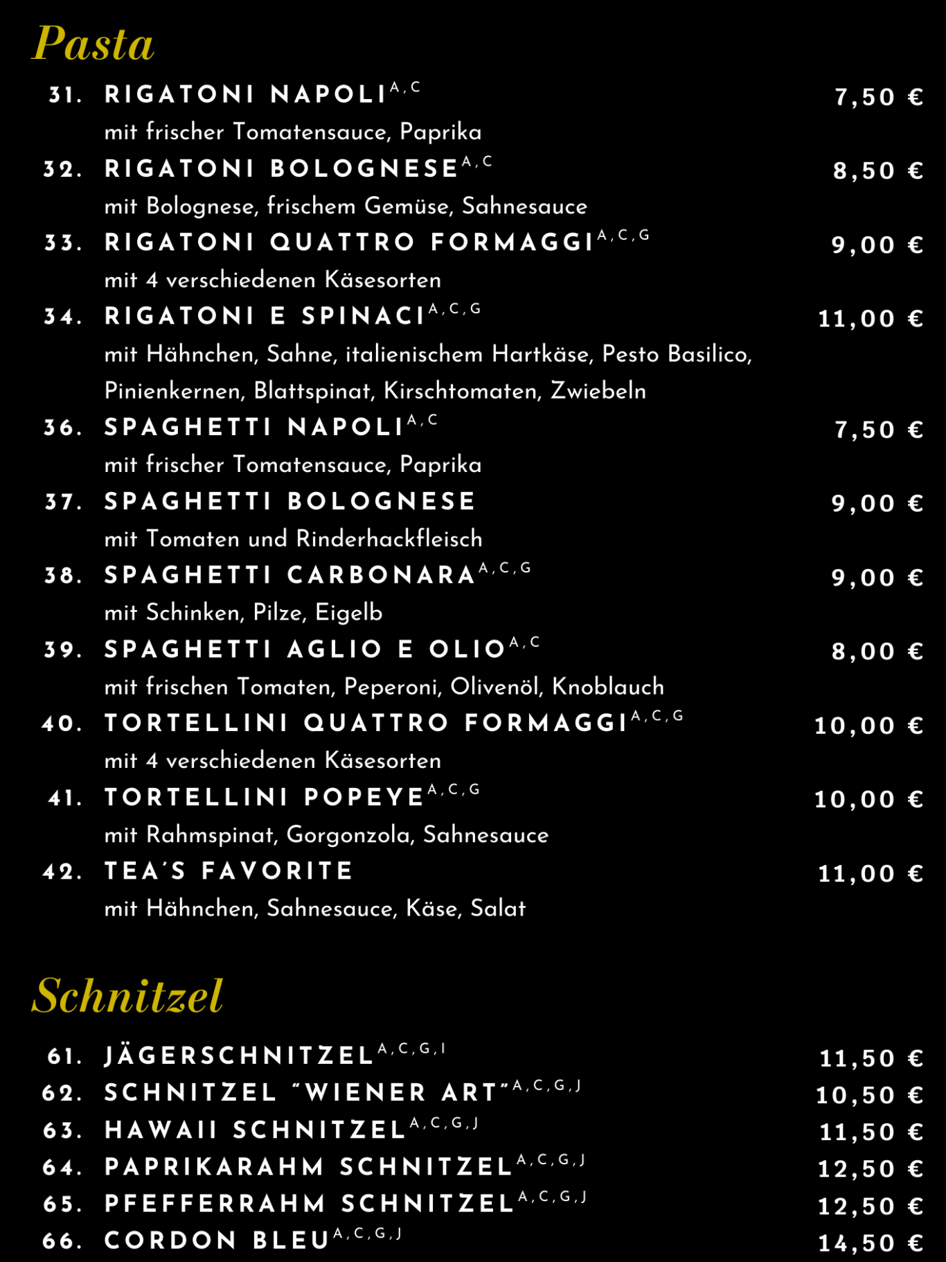 Allergene: A. glutenhaltiges Getreide B. Krebstiere und -erzeugnisse C. Eier und daraus gewonnene Erzeugnisse D. Fisch und Fischerzeugnisse E. Erdnüsse und Erzeugnisse F. Soja G. Milch und Milcherzeugnisse H. Schalenfrüchte und Erzeugnisse I. Sellerie und Erzeugnisse J. Senf und Erzeugnisse K. Sesamsamen und Erzeugnisse L. Schwefeldioxid und Erzeugnisse (E220 E228) M. Weichtiere und Erzeugnisse